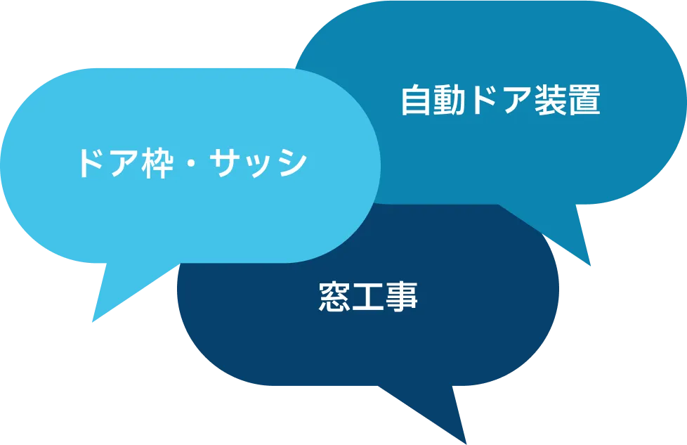 私たちは自動ドアの設計や施工、販売・メンテナンスを主軸としていますが、手動ドアや半自動ドアの設置・修理、ドア枠やサッシなどの工事も実施しています。入口周りのあらゆるご要望にワンストップでお応えできるよう、充実した体制を整えています。